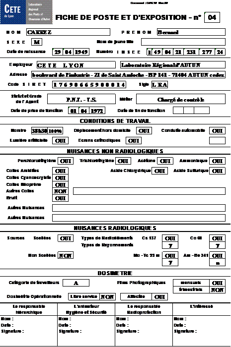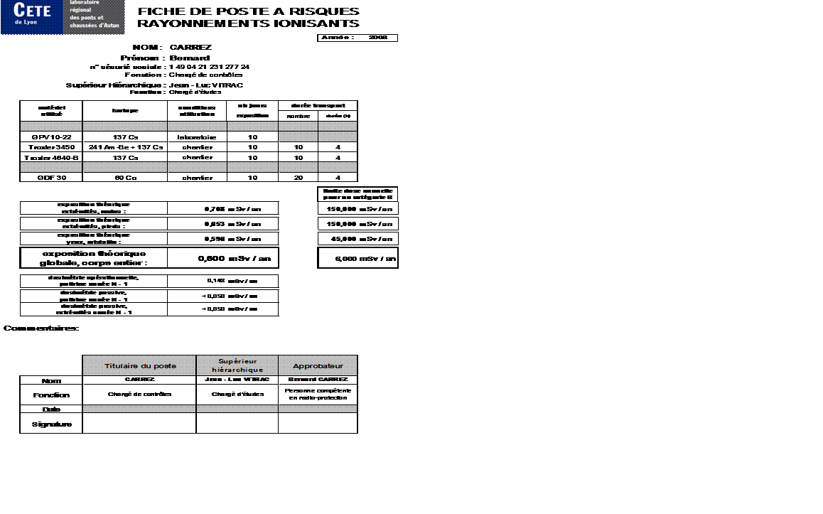 Ce qui amène également à la rédaction d’une fiche de poste et d’exposition. Nous vous proposons ici le modèle du CETE du laboratoire régional d’Autun.