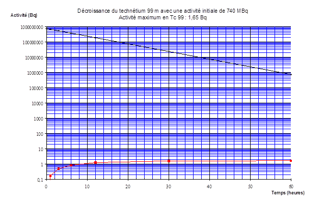 Le 2°) traite du cas du technétium 99 m. En effet après décroissance d’une source de 740 MBq de 99mTc, on obtient une activité en 99Tc égale à 1,6 Bq.