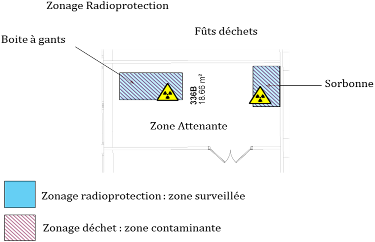 Les zones interdites mentionnées à ce même article sont toujours délimitées par les parois du volume de travail ou du local concerné. Une boîte à gants ou un local d’assainissement et de démantèlement peuvent très bien, de part l’activité qui se trouvent à l’intérieur, être classées en zone interdite. Ce peut être le cas à cause de l’exposition des extrémités (boîte à gants) ou de l’exposition interne (local d’assainissement et de démantèlement).